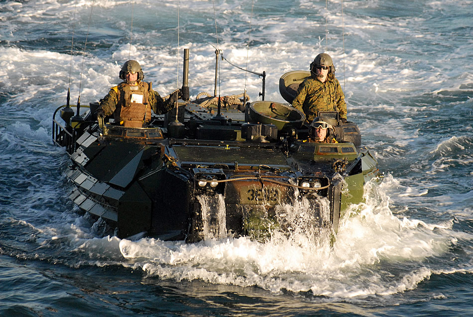 PACIFIC OCEAN (Feb. 22, 2010) An amphibious assault vehicle assigned to the 1st Battalion, 4th Marines attached to Bravo Company from Camp Pendleton, Calif., prepares to board the amphibious transport dock ship USS Dubuque (LPD 8) off the California coast during Amphibious Squadron and Marine Expeditionary Unit Integration (PMINT) training in preparation for an upcoming deployment. (U.S. Navy photo by Mass Communication Specialist 1st Class David McKee)