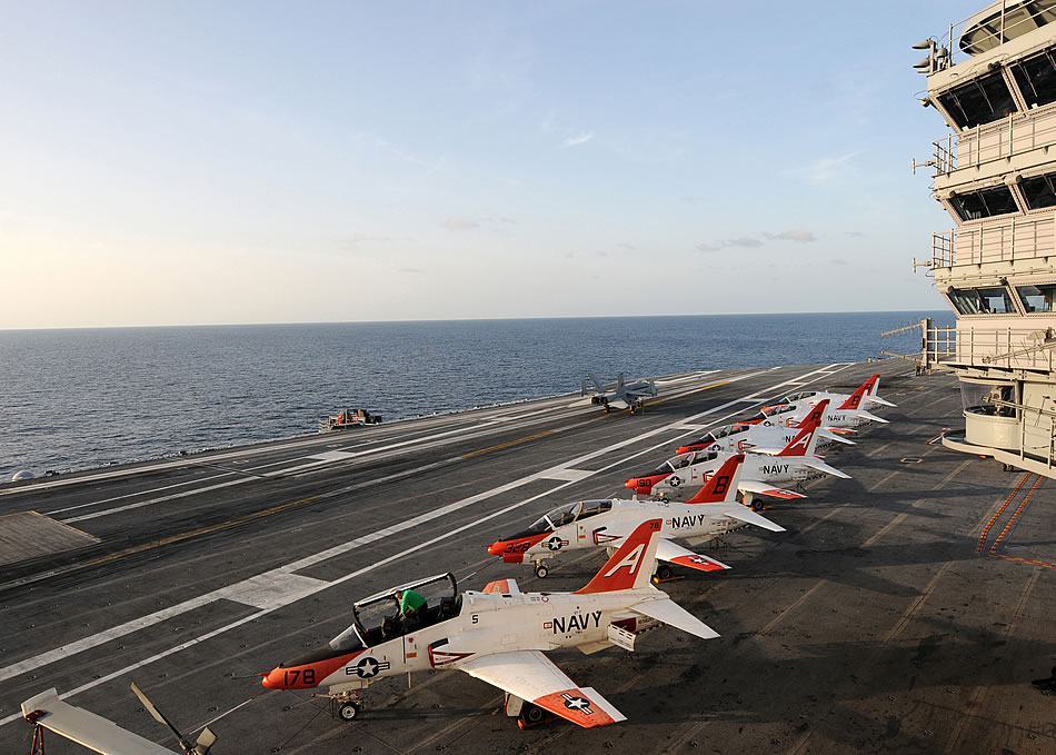 ATLANTIC OCEAN (July 18, 2010) T-45C Goshawk training aircraft assigned to Training Wing (TRAWING) 1 and 2 line the flight deck aboard the aircraft carrier USS George H.W. Bush (CVN 77). George H.W. Bush is conducting training in the Atlantic Ocean. (U.S. Navy photo by Mass Communication Specialist Seaman Leonard Adams)
