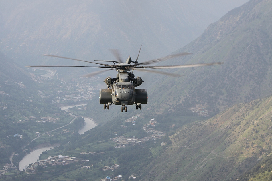 Navy Sea Dragon from HM-15 Detachment 2, Helicopter Mine Countermeasures Squadron 15, navigates Kalam Vally en route to load relief supplies during humanitarian relief efforts in the Khyber-Pakhtunkhwa Province, Pakistan. Photo by Capt. Paul Duncan