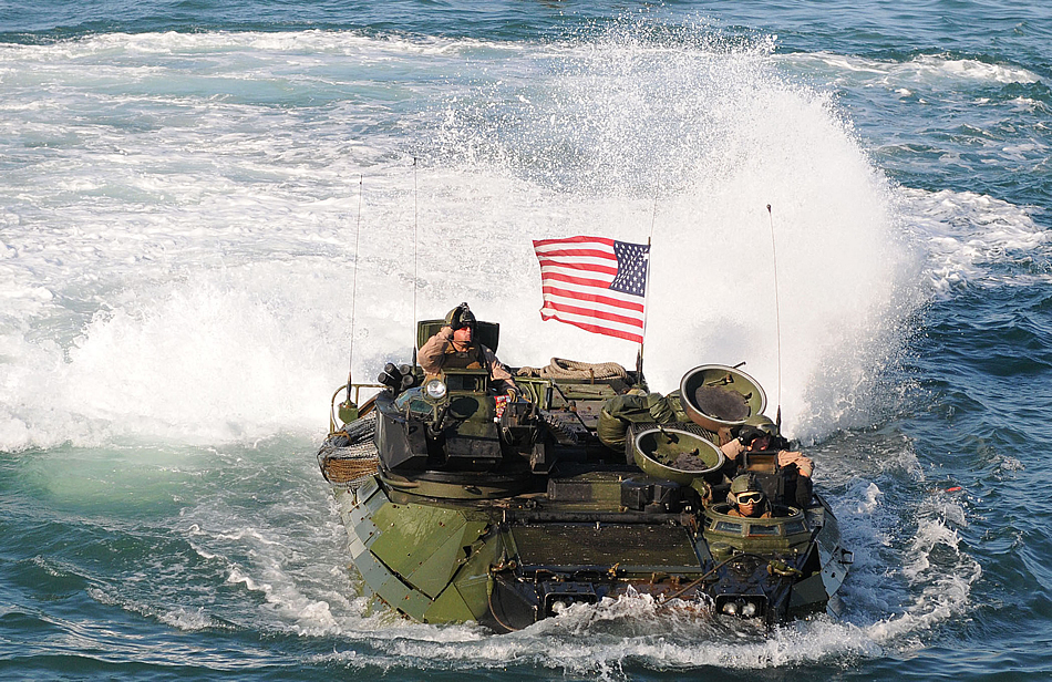 ATLANTIC OCEAN (Aug. 30, 2010) An amphibious assault vehicle (AAV) prepares to enter the well deck of the amphibious dock landing ship USS Carter Hall (LSD 50). Carter Hall is part of the Kearsarge Amphibious Ready Group (ARG) en route to Pakistan to help provide humanitarian assistance and disaster relief to flood-stricken regions. (U.S. Navy photo by Mass Communication Specialist 3rd Class Kristen Grover)