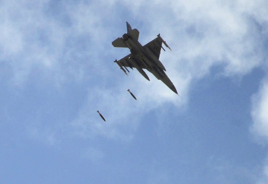 An F-16 Fighting Falcon drops two 500-pound bombs on a target during the Falcon Air Meet 2010 Nov. 1, 2010, at Muwaffaq Salti Air Base in Azraq, Jordan. The F-16 is with the 77th Fighter Squadron at Shaw Air Force Base, S.C. (U.S. Air Force photo/Staff Sgt. Eric Harris)