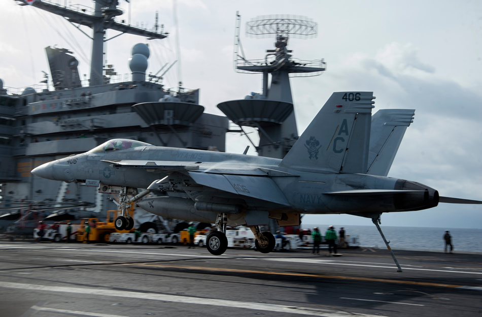 ATLANTIC OCEAN (Jan. 15, 2013) An F/A-18E Super Hornet assigned to the Gunslingers of Strike Fighter Squadron (VFA) 105 lands aboard the aircraft carrier USS Harry S. Truman (CVN 75). Harry S. Truman is underway conducting composite training unit exercise (COMPTUEX) in preparation for its upcoming deployment. (U.S. Navy photo by Mass Communication Specialist 3rd Class Lorenzo J. Burleson)