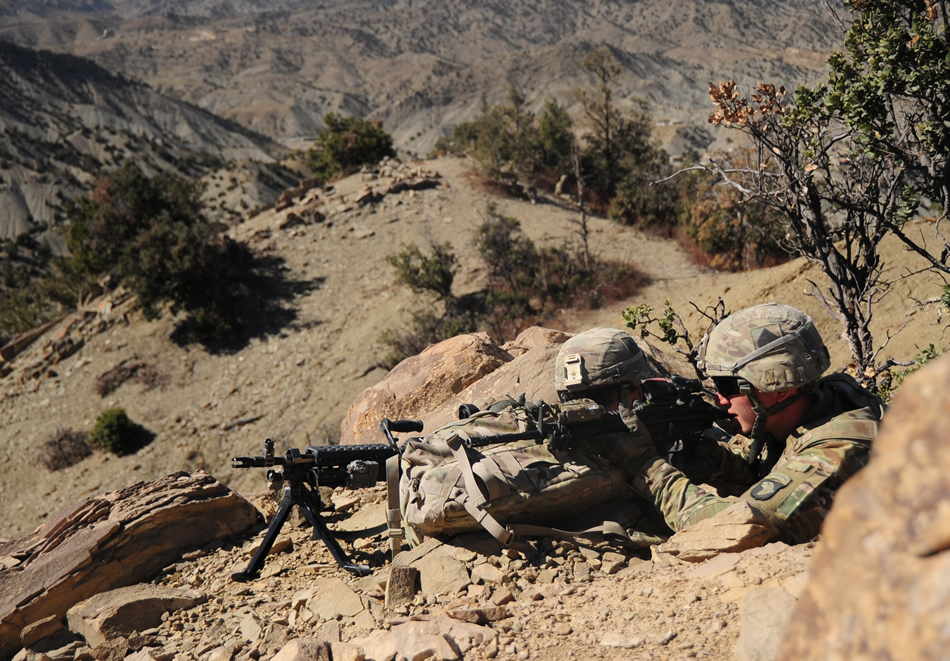 A M240 machinegun team provides security while in an observation post with 1st Platoon, Gunfighter Company, 1st Battalion, 506th Infantry Regiment "Red Currahee", 4th Brigade Combat Team, 101st Airborne Division (Air Assault), on a joint patrol with Afghan National Army Soldiers with 6th Khandak, 1st Brigade, 203rd Corps from Combat Outpost Wilderness, Afghanistan, Oct. 21, 2013. (U.S. Army photo by Staff Sgt. Todd A. Christopherson, 4th Brigade Combat Team Public Affairs