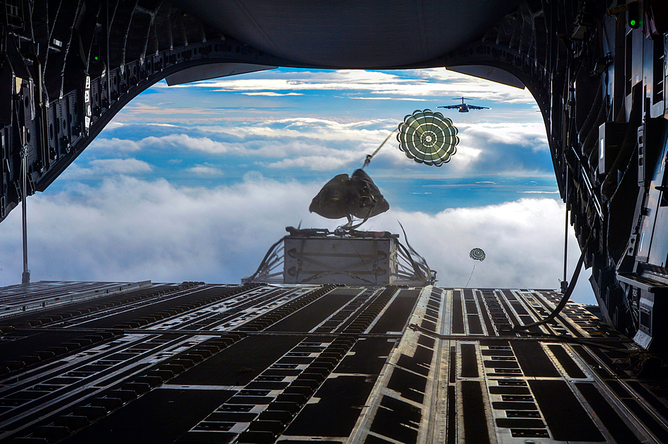 Two heavy container delivery systems plunge from the back of a C-17 Globemaster III aircraft to forces on the ground during the simulated Rainier War Dec. 6, 2014, over the Rainier drop zone, Wash. The Joint Concept for Entry Operations doctrine defines forcible entry as the seizing and holding of a lodgment in the face of armed opposition. (U.S. Air Force photo/Staff Sgt. Russ Jackson)