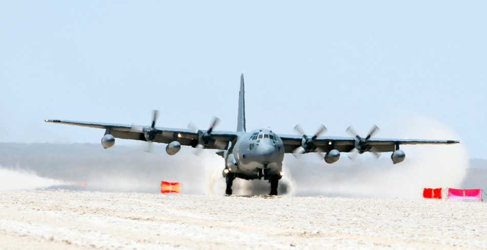 A HC-130 Combat King lands during a forward arming and refuel point exercise Mar 12, 2015, at Grand Bara, Djibouti. The Combat King provided several smaller airframes a refueling point to help extend their flying distance in preparation to any crisis response mission. (U.S. Air Force photo/Staff Sgt. Kevin Iinuma)