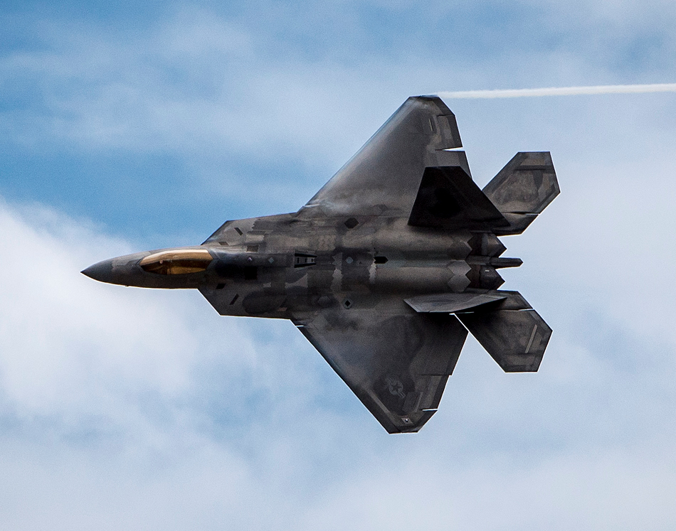 An F-22 Raptor demonstrates its maneuverability during the Wings Over the Pacific air show Sept. 28, 2014, at Joint Base Pearl Harbor-Hickam, Hawaii. The Raptor’s sophisticated aero design, advanced flight controls, thrust vectoring, and high thrust-to-weight ratio provide the capability to outmaneuver all current and projected aircraft. (U.S. Air Force photo/Capt. Raymond Geoffroy)