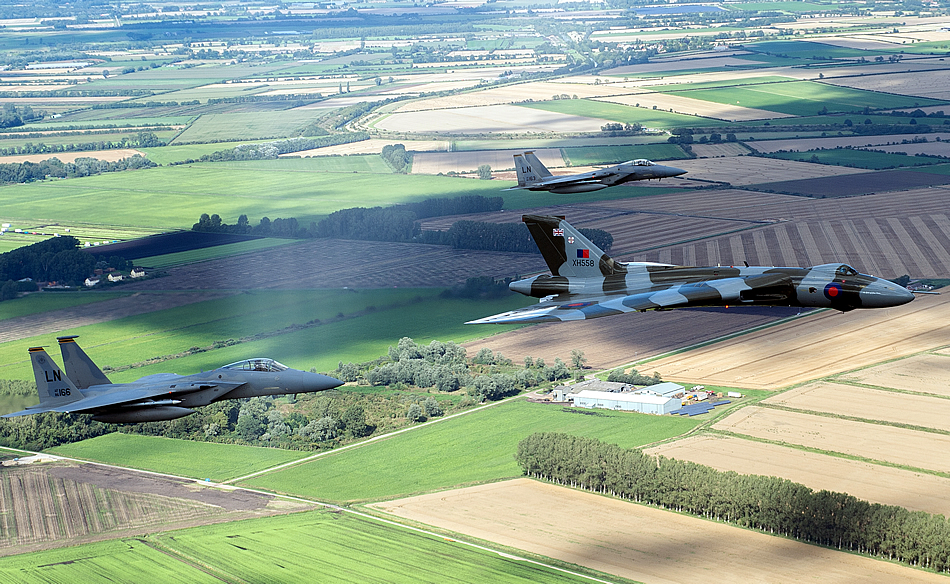 The U.K. Avro Vulcan XH558, accompanied by two F-15C Eagles assigned to the 48th Fighter Wing, fly over Royal Air Force Lakenheath, England, Aug. 27, 2015, during a flyover. This historic event marks the first and last time these aircraft will ever fly together. This particular Vulcan was the first one to be delivered to the RAF and now the last complete Vulcan in the world. (U.S. Air Force photo/Senior Airman Trevor T. McBride)