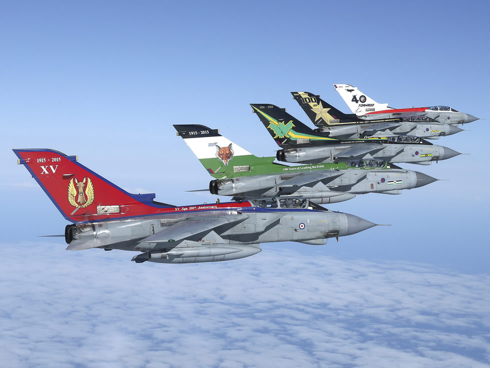 Royal Air Force Marham saw a historic event last week as four of it’s Tornado GR4 aircraft, alongside a fifth aircraft from RAF Lossiemouth, took part in a routine training sortie with a twist.Four of the jets carried a special centenary painted tail fin commemorating the 100th anniversary of each individual squadron with the fifth jets tail fin celebrating 40 years of the Tornado. Image by Senior Aircraftman Rob Travis RAF © UK MoD Crown Copyright 2015