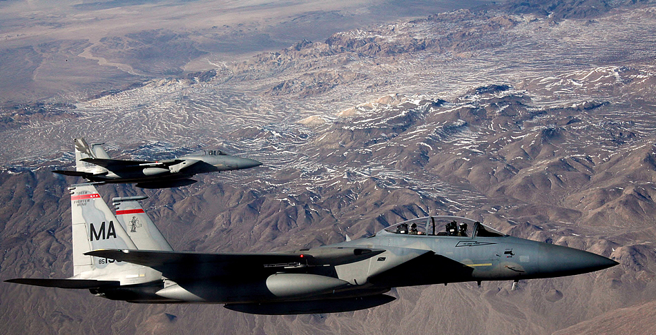 F-15C Eagles assigned to the 131st Fighter Squadron at Barnes Air National Guard Base, Mass., and the 194th Fighter Squadron at Fresno Air National Guard Base, Calif., wait to refuel beside a KC-135 Stratotanker during a Red Flag 16-1 training mission on Feb. 11, 2016. The concept of Red Flag was developed by Maj. Moody Suter to simulate the first 10 combat missions pilots would face. (U.S. Air Force photo/Master Sgt. Burt Traynor)