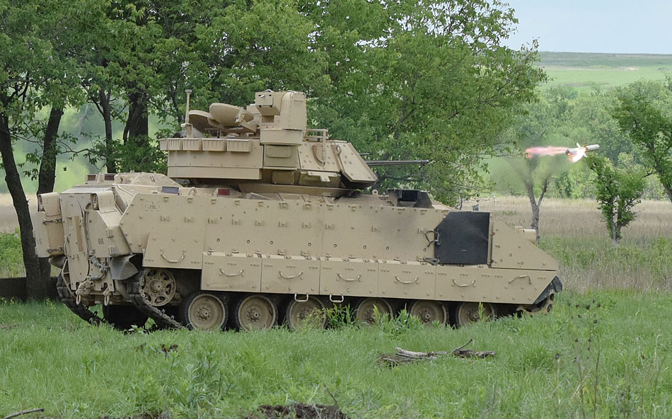 U.S. Army Soldiers, assigned to 1st Armored Brigade Combat Team, 1st Infantry Division, fire a TOW missile from a Bradley Fighting Vehicle during training at Fort Riley, Kansas, May 18, 2016. U.S. Army photo by Capt. Jonathan Camire