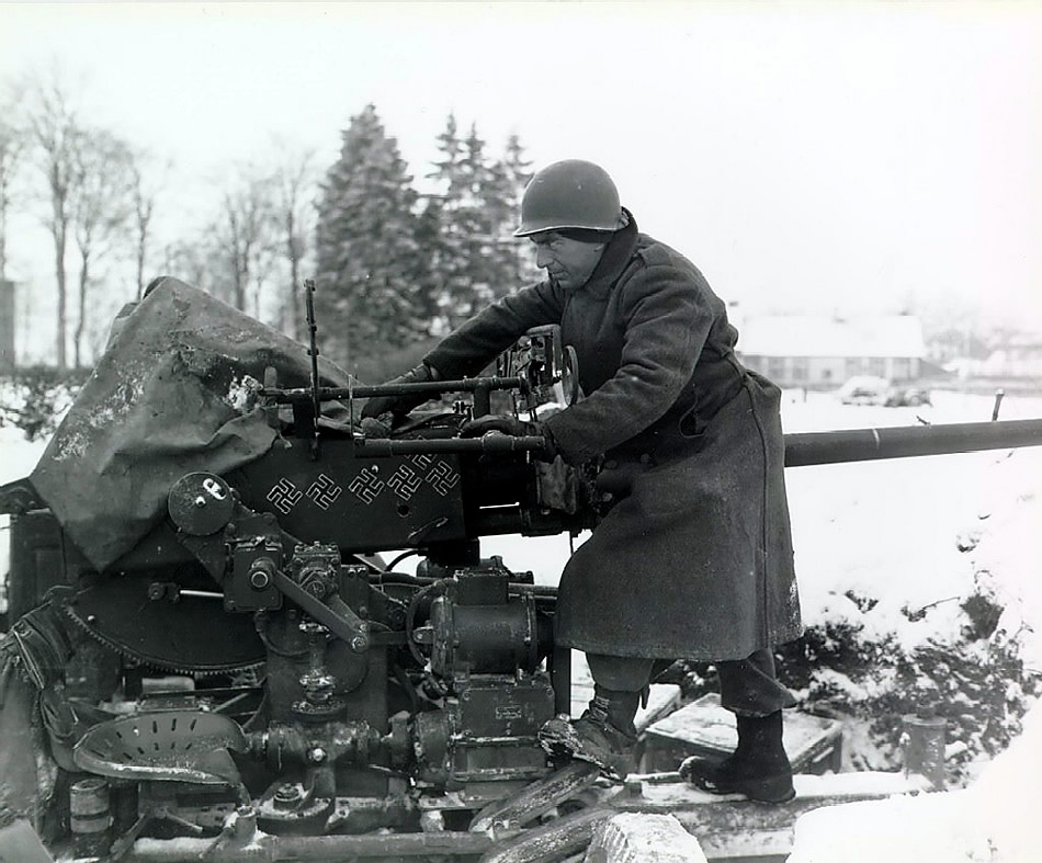 Private Paul Romanick wipes and cleans a 40-mm antiaircraft gun at snow-covered Sourbrodt, Belgium. He is with an antiaircraft battery of the 1st Infantry Division, U.S. First Army. The gun has six swastikas painted on it, one for each German plane it has brought down. Battery B, 103d Antiaircraft Artillery Battalion, attached to the 1st Infantry Division. 12/31/44