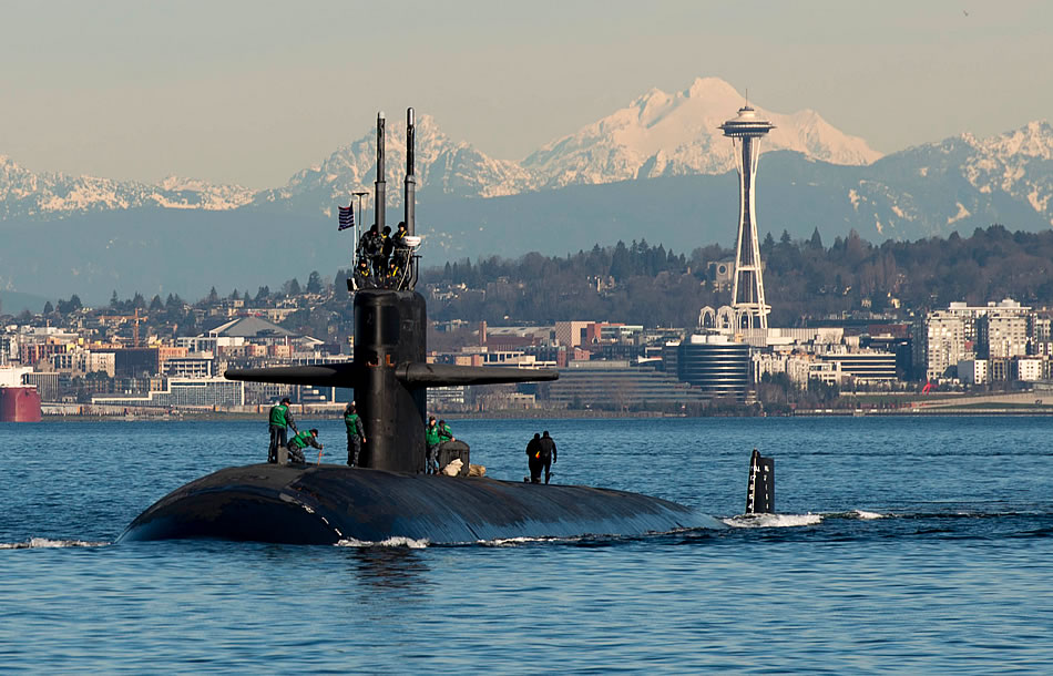 PUGET SOUND, Wash. (Jan. 27, 2017) The Los Angeles-class fast-attack submarine USS Olympia (SSN 717) transits Puget Sound en route to Olympia, Wash., for a port visit. The crew is visiting Olympia to conduct community relations projects and interact with community members. (U.S. Navy photo by Mass Communication Specialist 1st Class Amanda R. Gray)