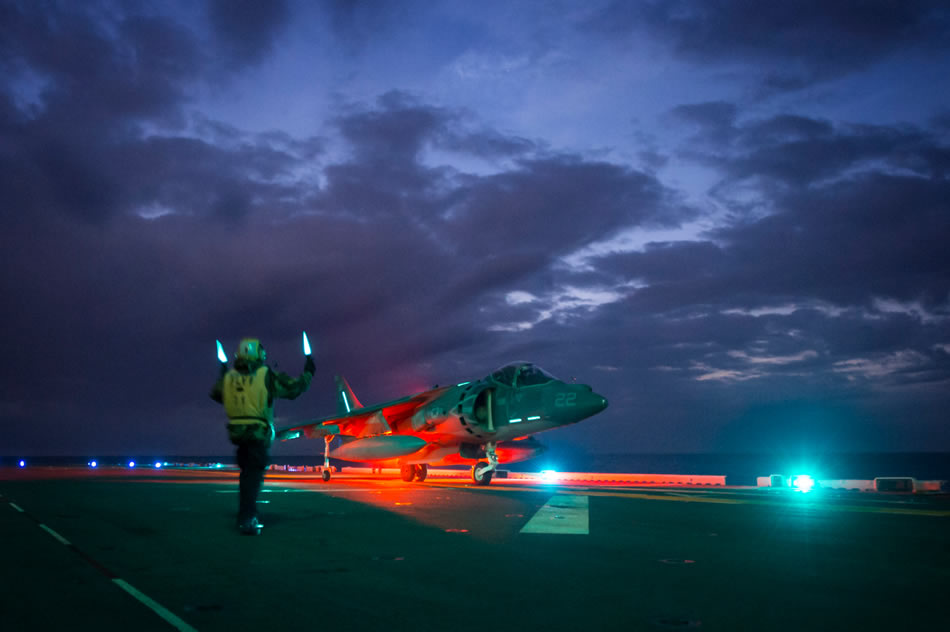PHILIPPINE SEA (Feb. 8, 2017) An AV-8B Harrier II, assigned to the "Tomcats" of Marine Attack Squadron (VMA) 311, lands aboard the amphibious assault ship USS Bonhomme Richard (LHD 6). The ship is conducting unit-level training to ensure warfighting readiness in preparation for a routine patrol in support of security and stability in the Indo-Asia Pacific region. (U.S. Navy photo by Mass Communication Specialist 2nd Class Diana Quinlan)