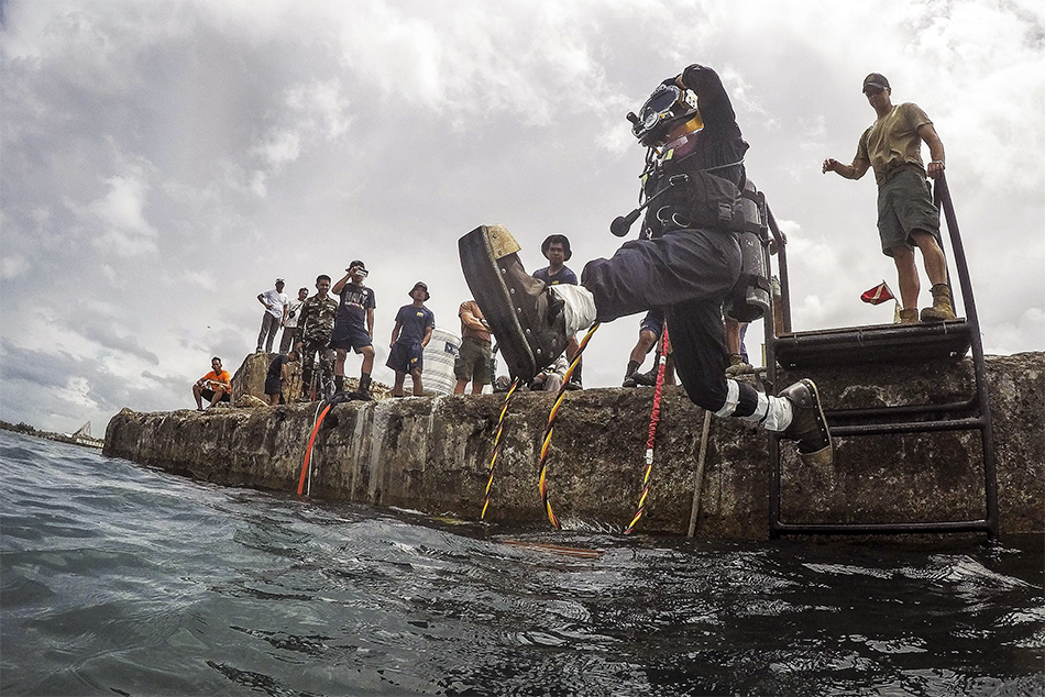 Navy Petty Officer 2nd Class Greg Lewis jumps into the water during an underwater surface-supply dive at Ipil Port in Ormoc City, Philippines, May 12, 2017, as part of exercise Balikatan 2017. The dive training prepared Philippine and U.S. service members to clear debris in ports and open up supply lines. Lewis is a construction electrician assigned to Underwater Construction Team 2. Navy photo by Petty Officer 3rd Class Alfred A. Coffield