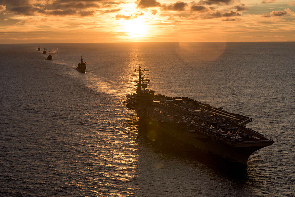 PACIFIC OCEAN (June 29, 2017) Ships assigned to Carrier Strike Group 5 sail in formation during a live-fire gunnery exercise. The aircraft carrier USS Ronald Reagan (CVN 76) is the flagship of Carrier Strike Group 5, providing a combat-ready force that protects and defends the collective maritime interests of its allies and partners in the Indo-Asia-Pacific region. (U.S. Navy photo by Mass Communication Specialist 2nd Class Nathan Burke)