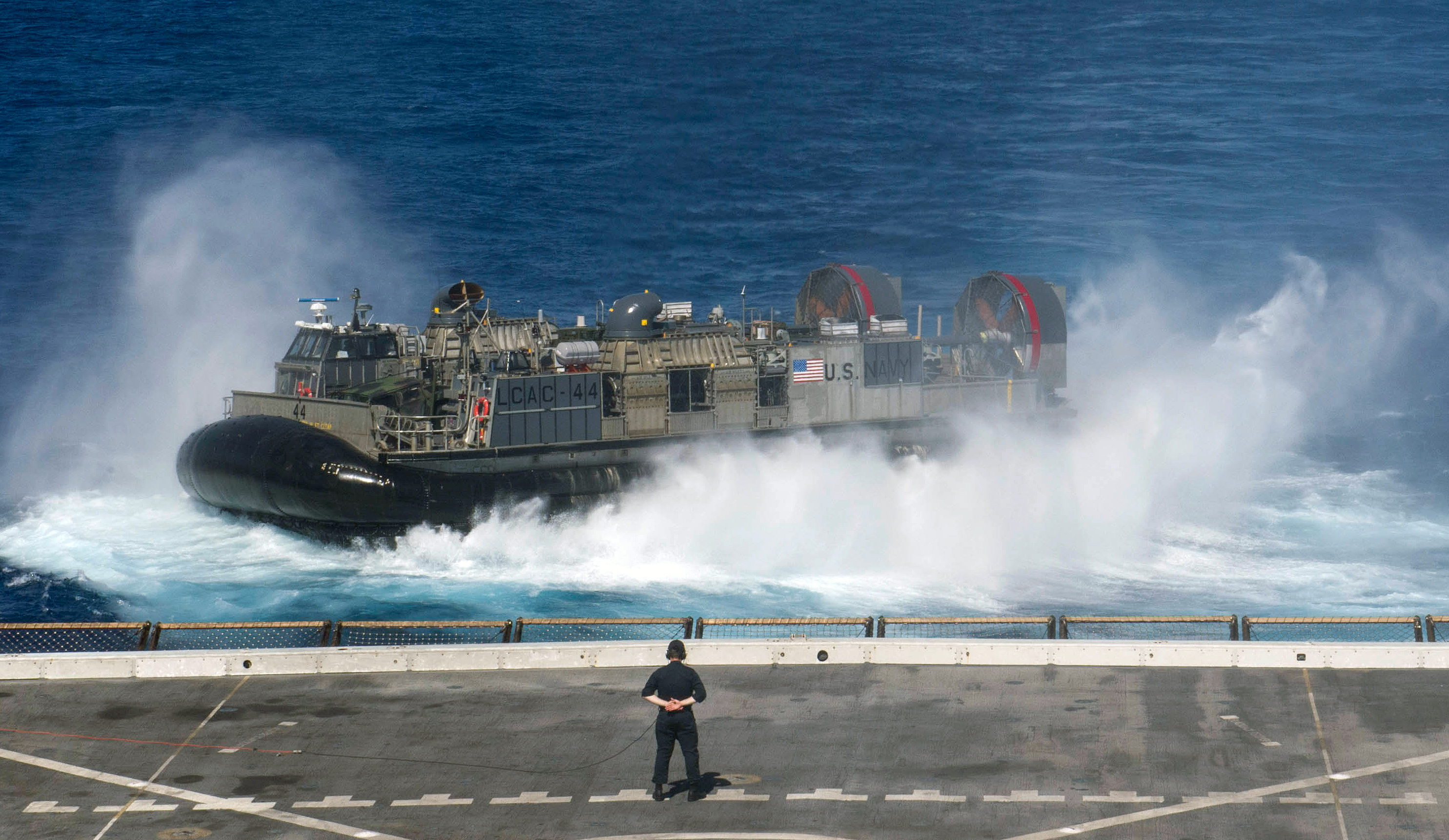PACIFIC OCEAN (July 15, 2017) A landing craft, air cushion assigned to Assault Craft Unit 5 exits the amphibious transport dock ship USS San Diego's (LPD 22) well deck off the coast of Hawaii during a sustainment exercise. San Diego is on a scheduled deployment with the America Amphibious Ready Group, which is comprised of more than 1,800 Sailors and 2,600 Marines assigned to the amphibious assault ship USS America (LHA 6), the amphibious dock landing ship USS Pearl Harbor (LSD 52), and San Diego. (U.S. Navy photo by Mass Communication Specialist 3rd Class Justin A. Schoenberger)