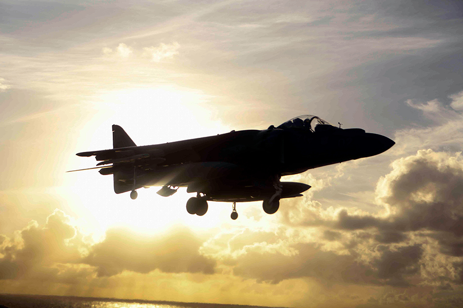 PACIFIC OCEAN (July 16, 2017) An AV-8B Harrier assigned to Marine Tiltrotor Squadron 161 (Reinforced) prepares to make a vertical landing on the flight deck of the amphibious assault ship USS America (LHA 6). The ship and its amphibious ready group are deployed to the 3rd, 5th and 7th fleet areas of responsibility as a crisis response and contingency force. (U.S. Marine Corps photo by Lance Cpl. Jacob Pruitt)