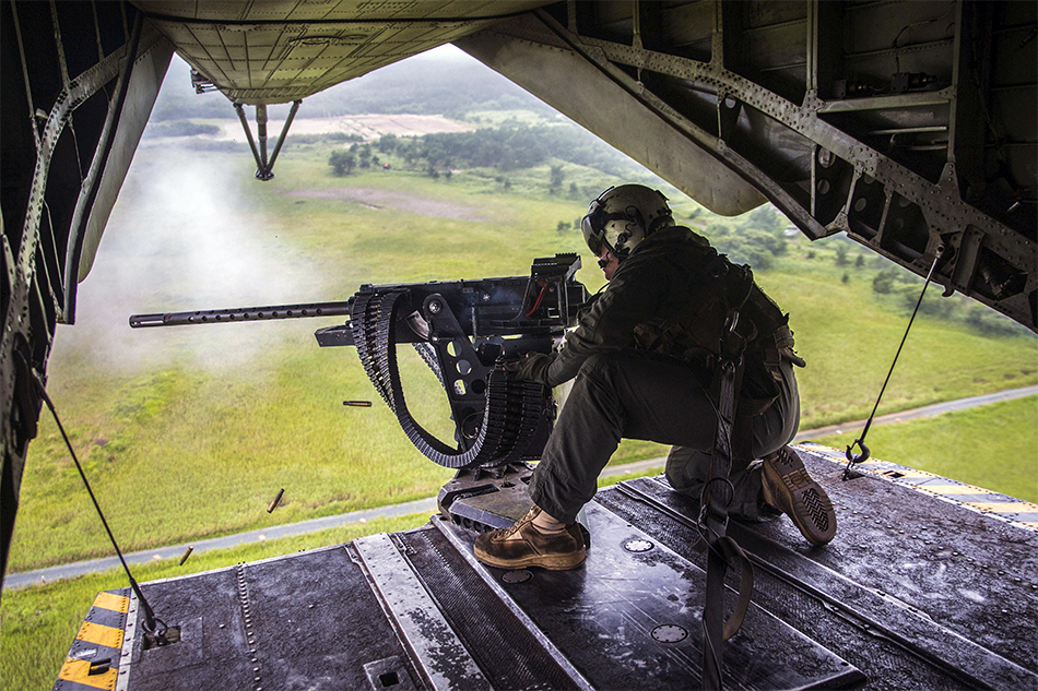 A Marine Corps crew chief fires an M2 .50-caliber machine gun from the back of a CH-53E Super Stallion helicopter near Misawa Air Base, Japan, August 21, 2017, during exercise Northern Viper 17. Marine Corps photo by Lance Cpl. Andy Martinez