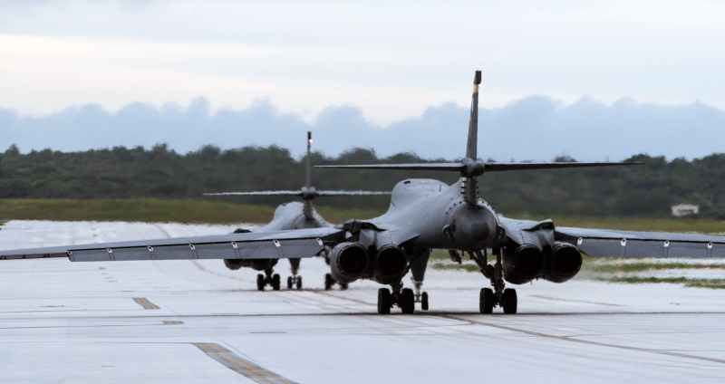 Two U.S. Air Force B-1B Lancers assigned to the 37th Expeditionary Bomb Squadron, deployed from Ellsworth Air Force Base (AFB), S.D., taxis before take off from Andersen AFB, Guam to fly sequenced bilateral missions with two Japan Air Self-Defense Force (JASDF) F-15s and two Republic of Korea air force (ROKAF) F-15Ks in the vicinity of the Sea of Japan, Oct. 10, 2017. The purpose of bilateral training is to foster increased interoperability amongst Japan, South Korea and U.S. aircraft. Participating in bilateral training enables the operational units to improve their combined capabilities and tactical skills, while also building bilateral confidence and strong working relationships. (U.S. Air Force photo by Senior Airman Jacob Skovo)
