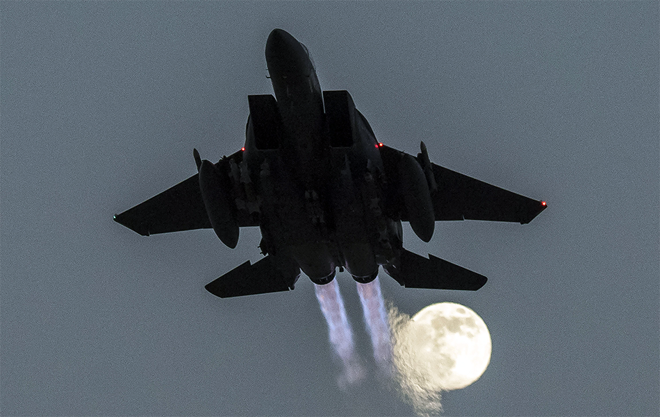 An F-15E Strike Eagle takes off from an undisclosed in Southwest Asia, July 7, 2017. The Eagle, assigned to the 332nd Air Expeditionary Wing, is supporting Operation Inherent Resolve to combat the threat of the Islamic State of Iraq and Syria. Air Force photo/Senior Airman Damon Kasberg