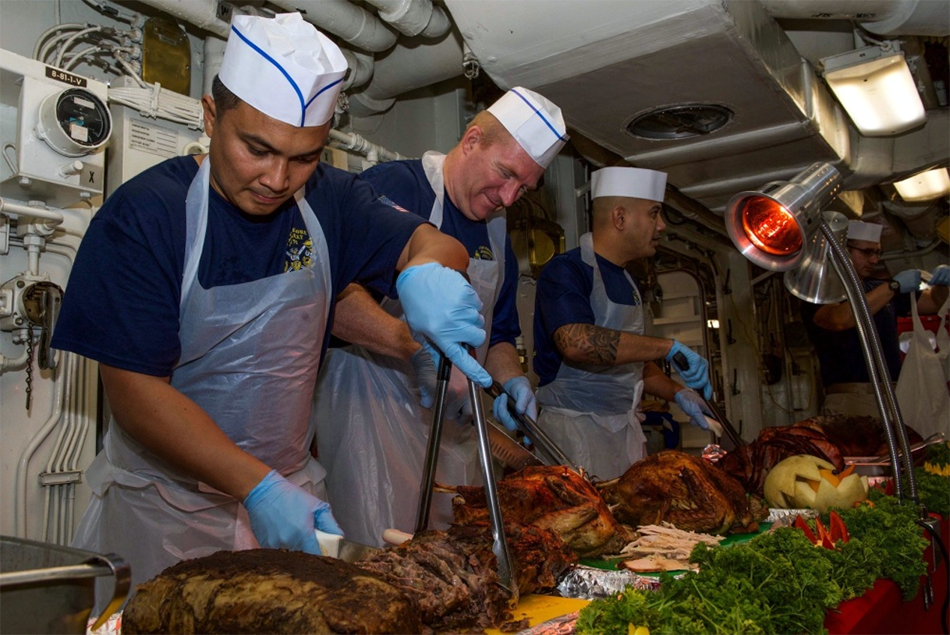 Navy chief petty officers serve Thanksgiving dinner to sailors and Marines on the mess decks of the aircraft carrier USS Theodore Roosevelt while underway in the Indian Ocean, Nov. 23, 2017. Theodore Roosevelt is deployed in support of maritime security operations and theater security cooperation efforts. Navy photo by MC3 Rachael Treon