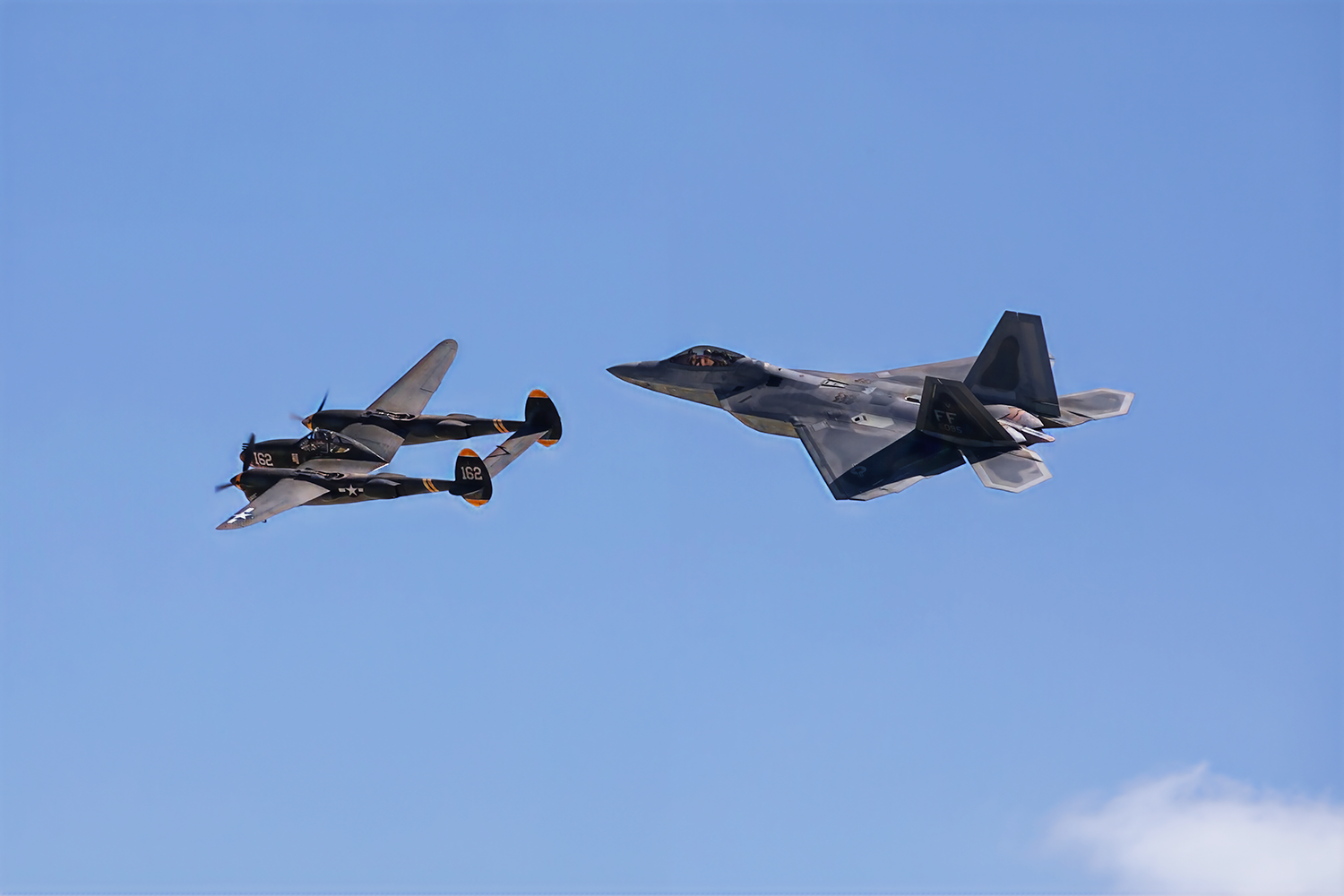 A U.S. Air Force F-22 Raptor performs an aerial demonstration alongside a P-38 Lightning during the 2025 Marine Corps Air Station Miramar Air Show in San Diego, Sept. 28, 2025. The F-22 Raptor Demonstration Team performs precision aerial maneuvers at Air Shows across the world to demonstrate the unique capabilities of the world's premier 5th generation fighter aircraft. (U.S. Marine Corps photo by Lance Cpl. Diego Berumen)