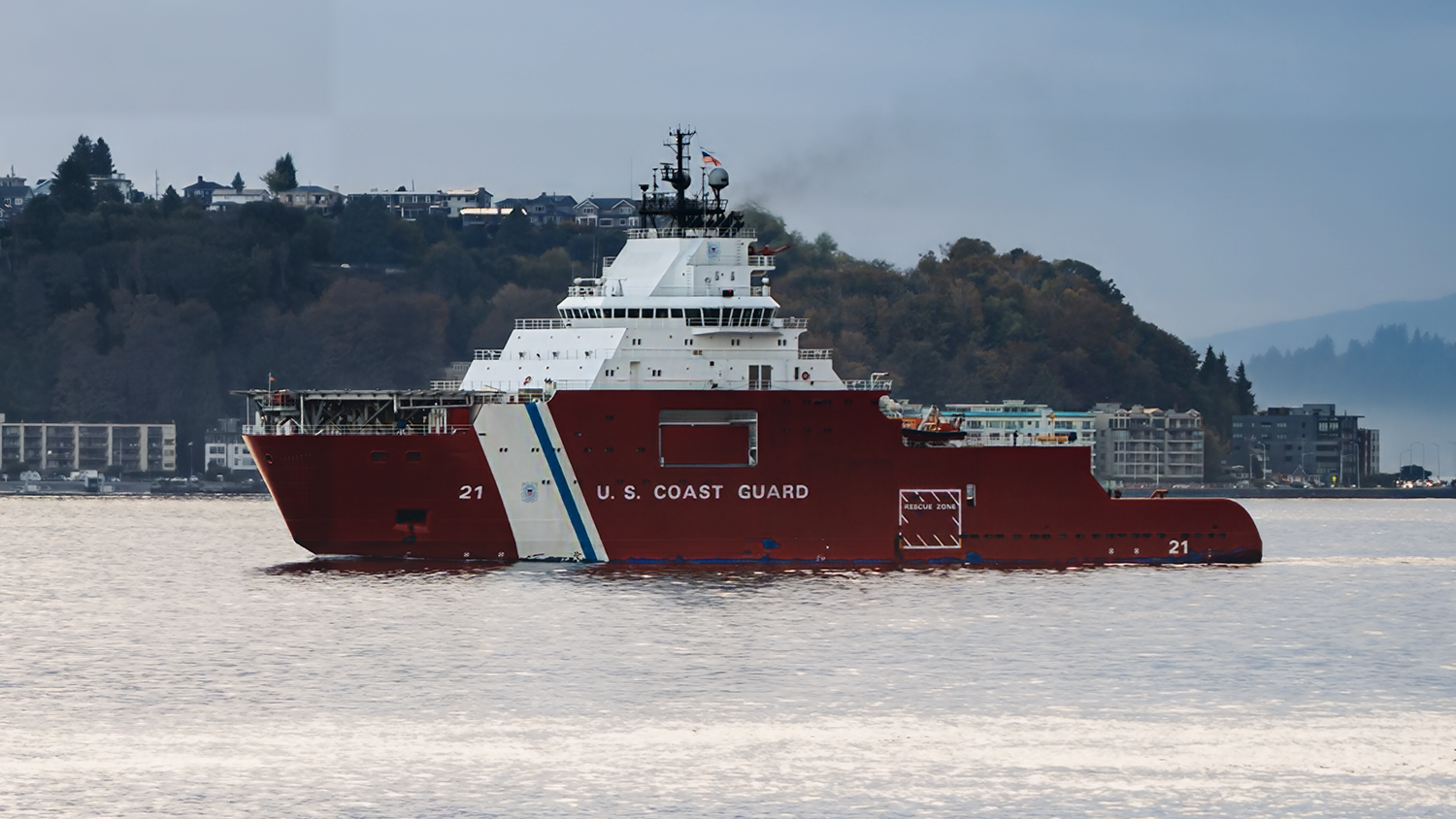 CGC Storis (WAGB-21) transits past West Seattle on its way to its temporary homeport at Coast Guard Base Seattle, Oct. 3, 2025. Storis was commissioned in Juneau, Alaska, Aug. 10, and the cutter is the Coast Guard’s first polar icebreaker acquired in over 25 years. (U.S. Coast Guard photo by Petty Officer 3rd Class Daylan M. Garlic-Jackson)