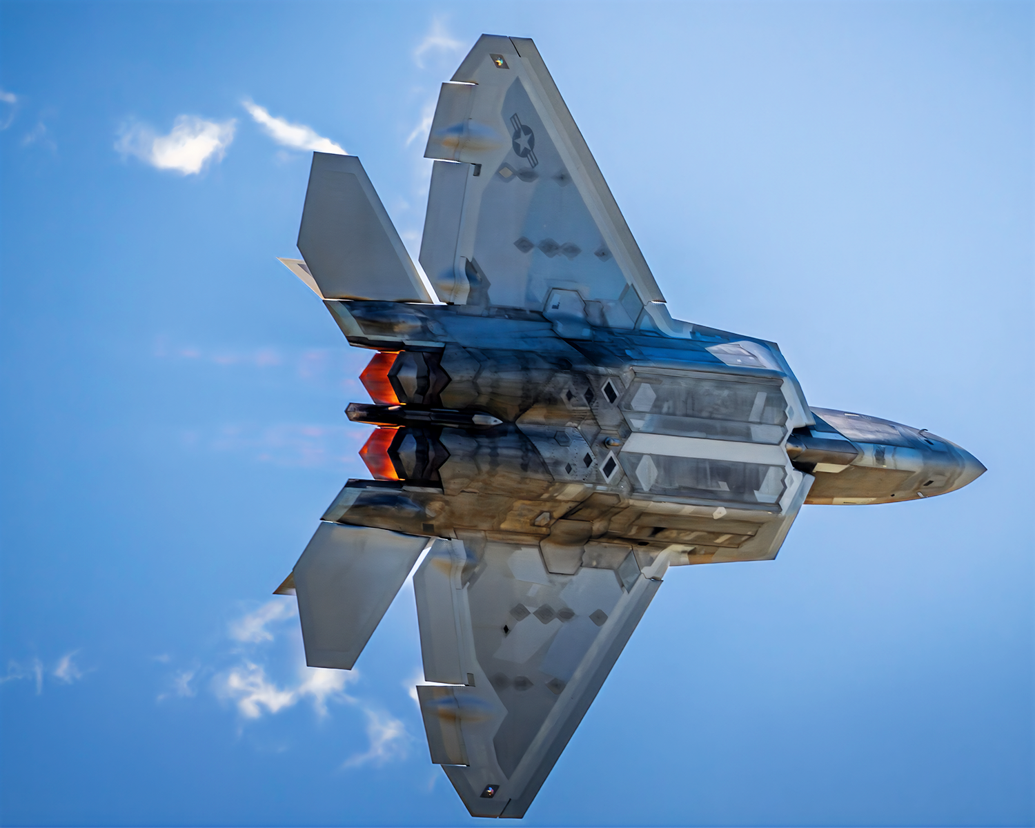 An F-22 Raptor performs an aerial demonstration at Naval Air Station Oceana, Virginia, Sept. 19, 2025. Rapid changes in angle of attack create visible vapor around the aircraft, providing a clear view of its aerodynamic performance. This demonstration highlights the F-22’s advanced maneuvering capabilities, showcasing its speed, agility, and thrust-vectoring performance. (U.S. Air Force photo by Staff Sgt. Lauren Cobin)