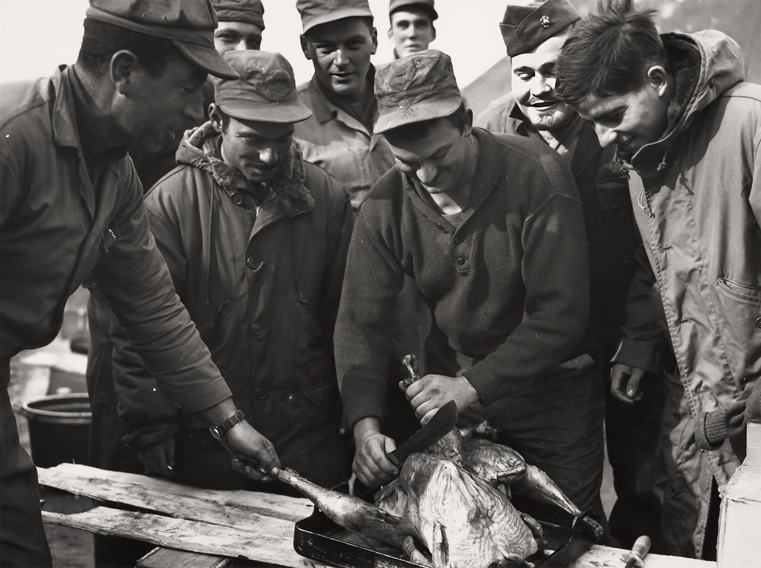 Thanksgiving turkey is prepared for members of the 5th Marines at Hagaru-ri, Korea, near the Chosin reservoir, 1950. Temperatures were so low that by the time the meals were delivered to frontline Marines, they were frozen.